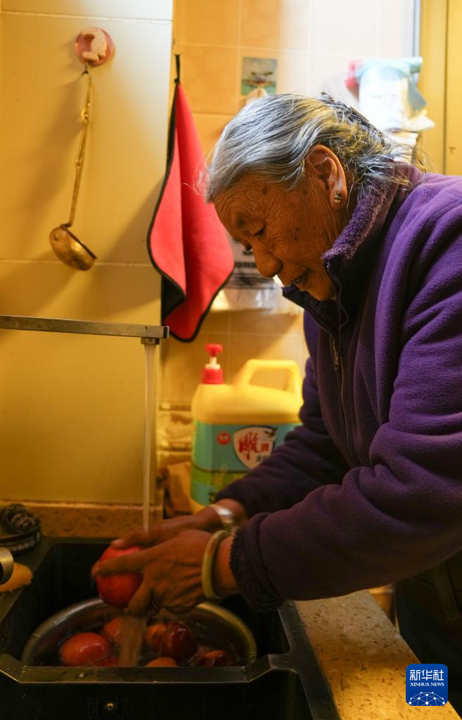 格桑玉珍在家中洗蘋果(4月3日攝)。新華社記者 晉美多吉 攝