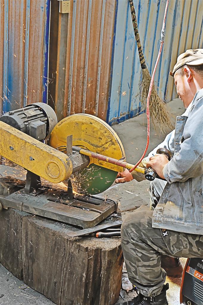 沿著民居錯(cuò)落的小路攀爬而上,來到江拉村易貢藏刀打制農(nóng)牧民合作社,傳承人西洛正在和線上購買者交流。寬敞的院壩和簡易工作間里,木屑紛飛、火花四濺、錚錚有聲,幾十個(gè)村民正在藏刀制作“流水線”上忙碌,一路采訪下來,我們也大致明白了易貢藏刀的制作流程: