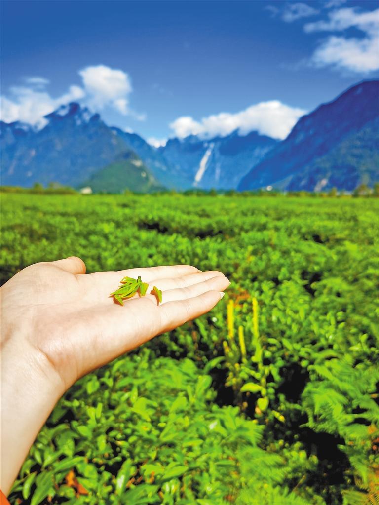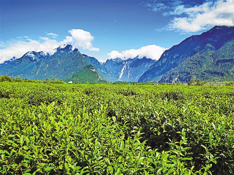 眼前,翠綠欲滴的千畝茶田連接碧色天空,連綿不絕的雪山聳入云霧,清水潺潺的聲音環(huán)繞耳邊,牛羊時(shí)不時(shí)抬頭望向行人。易貢茶場平均海拔2200米,雖地處青藏高原,但來自印度洋的暖濕氣流沿著雅魯藏布大峽谷進(jìn)入高原,為這片高原茶田帶來豐沛的降水?!岸瑹o嚴(yán)寒,夏無酷暑”,使茶樹能夠在這里茁壯成長。