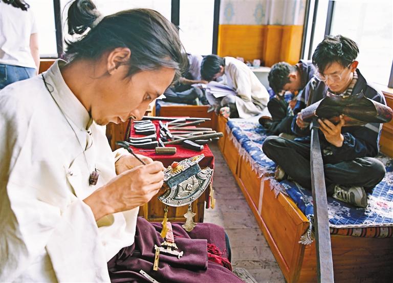 昌都市卡若區(qū)嘎瑪鄉(xiāng)位于扎曲河上游,群山環(huán)繞、風(fēng)光秀麗。嘎瑪鄉(xiāng)被譽(yù)為“民族手工藝之鄉(xiāng)”,當(dāng)?shù)厝罕娛来鷱氖绿瓶ɡL畫、金屬鍛造、石刻等,幾乎家家有工匠、戶戶有傳人。如今,在黨和政府的政策扶持下,嘎瑪鄉(xiāng)的手工藝品漸漸走出山溝,群眾也因此走上了致富路。