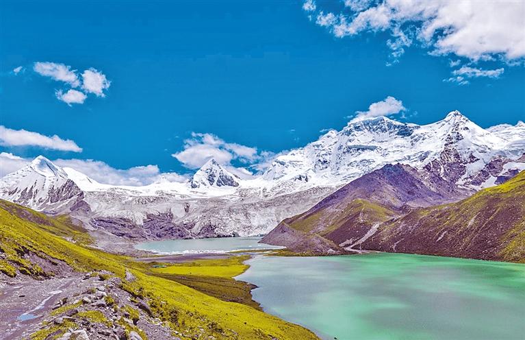 薩普雪山2016年才被發(fā)現(xiàn)并面世,是一處保護非常完整的天然冰川。其主峰海拔為6956米,北側(cè)有巨大的薩普冰川,冰川末端有一湖泊叫薩姆錯,海拔約4750米,薩姆錯分內(nèi)、外湖,內(nèi)湖為崗香童錯冰湖,終年不化,一年四季漂浮千年冰雕,形狀各異;外湖湖水碧綠,湖內(nèi)魚兒成群。