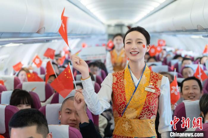 2月19日,西藏航空“拉薩-成都天府-香港”航線開(kāi)通。圖為航班上舉行首航慶祝儀式。 西藏航空供圖