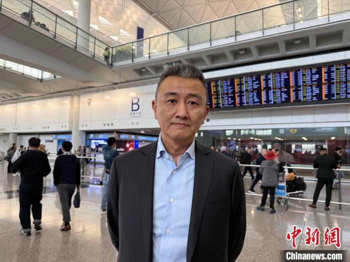 2月19日,西藏航空“拉薩-成都天府-香港”航線開(kāi)通。圖為西藏航空副總經(jīng)理張兵兵在香港國(guó)際機(jī)場(chǎng)抵港大堂接受中新社記者采訪?!≈行律缬浾?韓星童 攝