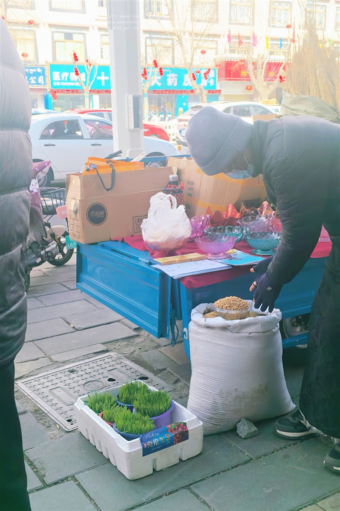 前來采購的格桑卓嘎阿姨,手里提著大包小包,臉上滿是笑意。她買了青稞酒、酥油、風(fēng)干肉還有青稞苗。新年時(shí),用青稞酒祈福,酥油茶招待客人,風(fēng)干牛肉和新鮮軟糯的拉拉、用酥油雕出精美圖案的“推”一起擺盤,供客人隨時(shí)食用?!敖衲辍磐弧汀矢隆峭惶?,打算全家圍坐一起吃。家里布置都按習(xí)俗,擺好切瑪、德卡、青稞苗,再給門窗換上新的‘香布’。孩子們買了不少藏文對(duì)聯(lián),說是要貼門上,祈福來年順?biāo)?。帶孩子來傳統(tǒng)市集,就是要讓他們記住咱們藏歷新年的習(xí)俗。這些年,市集多了些漂亮的藏式手工藝品,不過最有年味兒的,還得是這糌粑和青稞粒的香?!?/p>