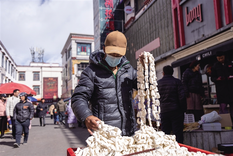 漫步在拉薩的大街小巷,“年的味道”愈發(fā)濃厚,家家戶戶采辦年貨的熱情也日益高漲,呈現(xiàn)出一派紅紅火火的熱鬧景象。那么,你知道藏歷新年的特色年貨都有哪些嗎?“羅薩梅朵”、羊頭、酥油花、“切瑪盒”……這些傳統(tǒng)年貨寓意著新的一年風(fēng)調(diào)雨順、五谷豐登、吉祥如意,是藏歷新年“必不可少”的年貨。2月21日,記者走上街頭,沉浸式體驗充滿“煙火氣”的濃濃年味。