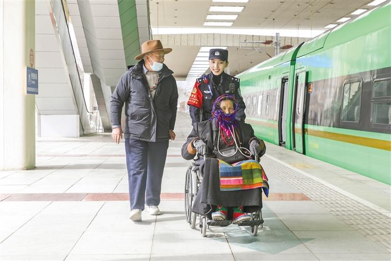 “格桑梅朵”女子乘務組乘警護送老年旅客安全乘車。