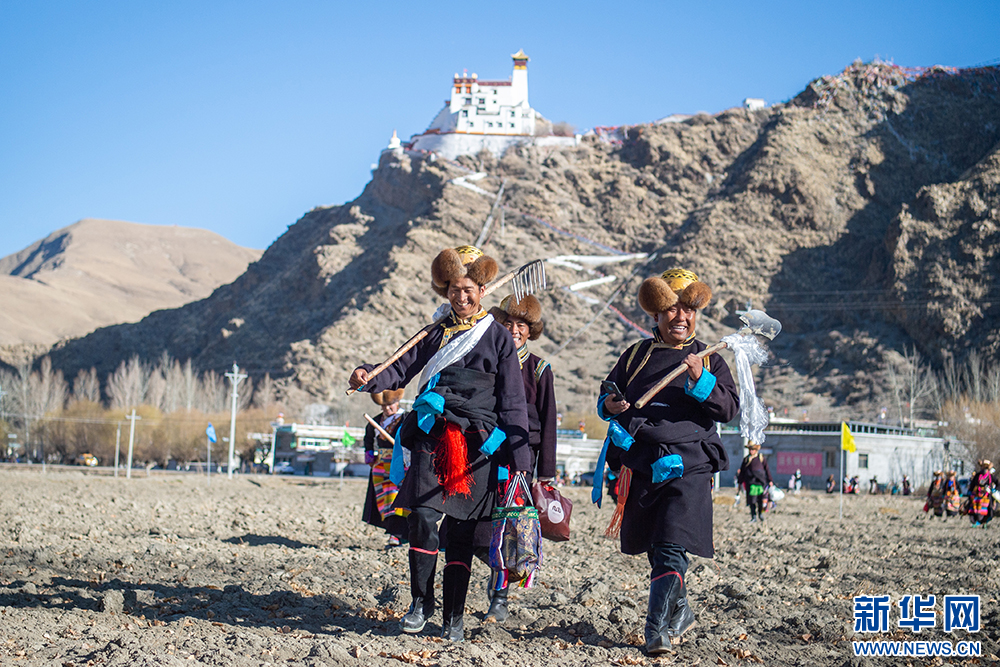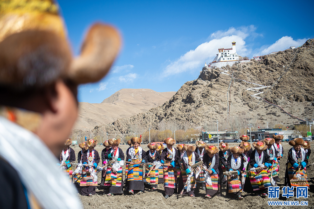 16日,西藏山南市乃東區(qū)門中崗社區(qū)的群眾按照傳統(tǒng)儀式,身著盛裝,手捧青稞酒,在雍布拉康宮殿腳下的西藏“第一塊農(nóng)田”舉行春耕儀式,播撒今春第一粒種子。
