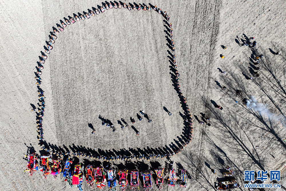 圖為西藏山南市乃東區(qū)門中崗社區(qū)春耕儀式現(xiàn)場(3月16日攝,無人機(jī)照片)。新華網(wǎng) 旦增努布 攝
