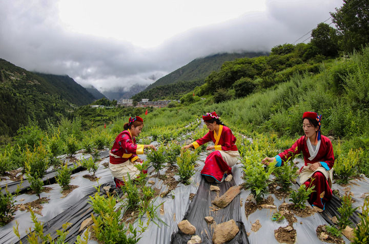2022年,安徽省援藏工作隊在勒布溝引入莓茶種植,試驗性種植30畝。這是當(dāng)?shù)卮迕裨诓烧瑁?023年7月28日攝)。新華社記者 旦增尼瑪曲珠 攝