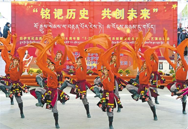 3月28日,拉薩市文旅局在宗角祿康公園舉辦了“銘記歷史 共創(chuàng)未來”拉薩市紀(jì)念西藏民主改革66周年暨 “3·28”西藏百萬農(nóng)奴解放紀(jì)念日群眾文藝演出。圖為演出現(xiàn)場的舞蹈表演。記者 洛桑 攝