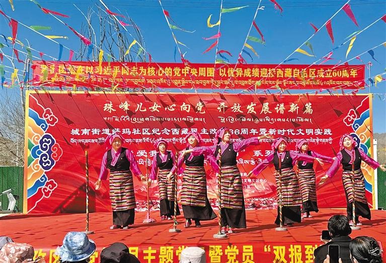 3月28日,日喀則市桑珠孜區(qū)城南街道薩瑪社區(qū)舉行紀念西藏民主改革66周年暨新時代文明實踐“我愛我家 幸福日喀則”活動演出現(xiàn)場。通訊員 次旦玉珍 攝
