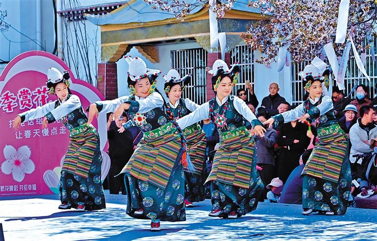 3月27日,“繁花映彩 共繪幸福”首屆文化藝術(shù)周暨 “3·28”西藏百萬農(nóng)奴解放紀念日活動在拉薩市城關(guān)區(qū)軍民路開幕。圖為活動現(xiàn)場歌舞表演。記者 王敏 攝