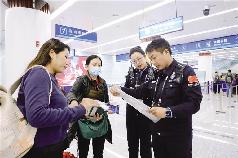 拉薩出入境邊防檢查站民警查驗(yàn)旅客出入境證件。圖由王美辰提供