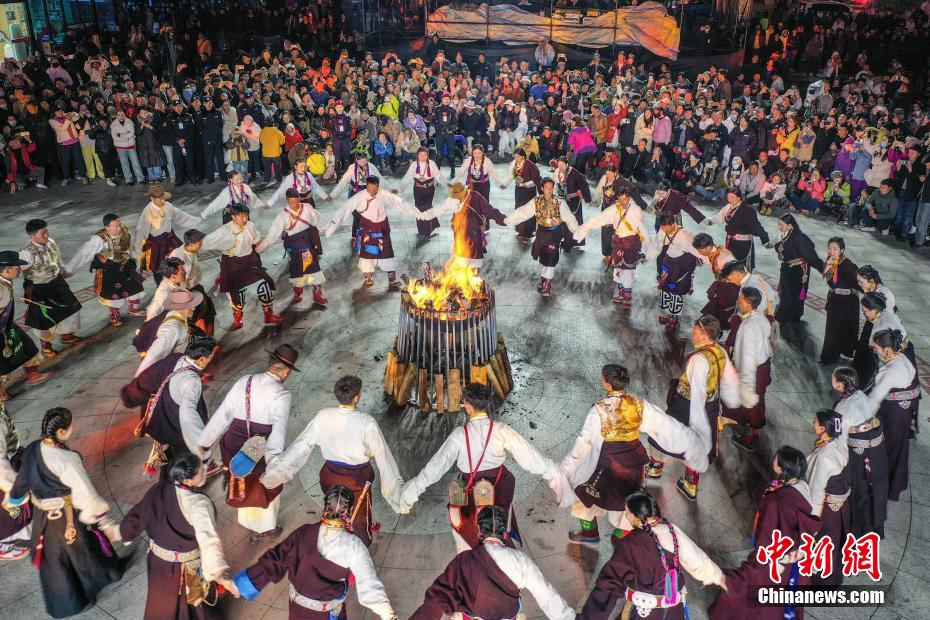 4月1日晚,西藏自治區(qū)林芝市第二十二屆桃花旅游文化節(jié)波密縣分會(huì)場的篝火鍋莊晚會(huì)熱鬧開場。晚會(huì)現(xiàn)場,熊熊篝火照亮夜空,當(dāng)?shù)孛癖娚碇?jié)日盛裝與游客手拉手,圍繞篝火跳起歡快的鍋莊舞,舞步輕盈、姿態(tài)優(yōu)美。熱情奔放的旋律,洋溢著濃郁的民族風(fēng)情,讓現(xiàn)場變成歡樂的海洋。此次活動(dòng)不僅展現(xiàn)了波密獨(dú)特的民俗文化魅力,也為桃花節(jié)增添了別樣色彩,吸引更多游客領(lǐng)略林芝波密縣春日盛景與人文風(fēng)情。圖為篝火鍋莊晚會(huì)現(xiàn)場。(無人機(jī)照片)