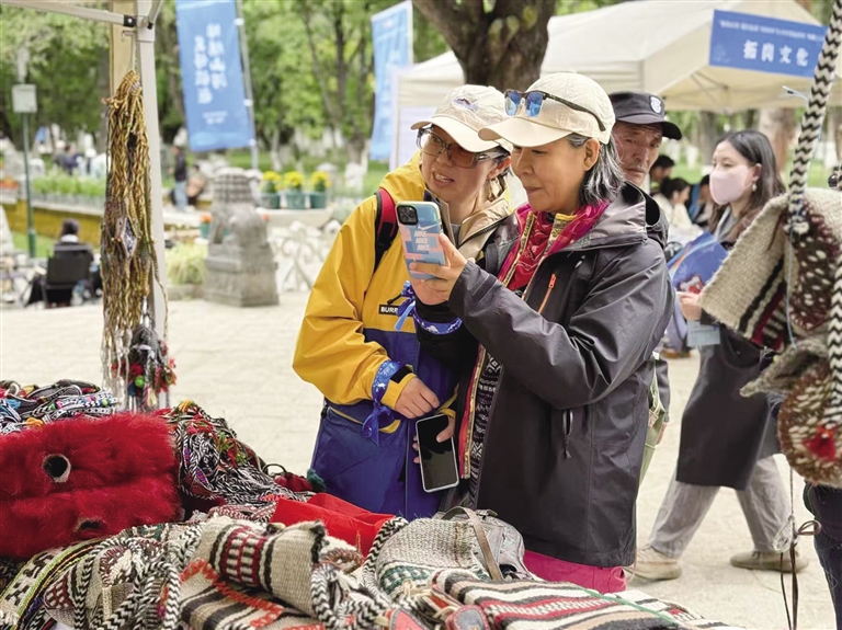 在西藏“非遺”文化體驗(yàn)區(qū),來(lái)自湖南的游客張麗一邊挑選包包一邊感嘆:“哇噻,真的太神奇了!沒想到牦牛毛還可以做成這么漂亮的包包,我要多買幾個(gè)帶回去給朋友。還能把這份獨(dú)特的文化記憶帶回家。”
