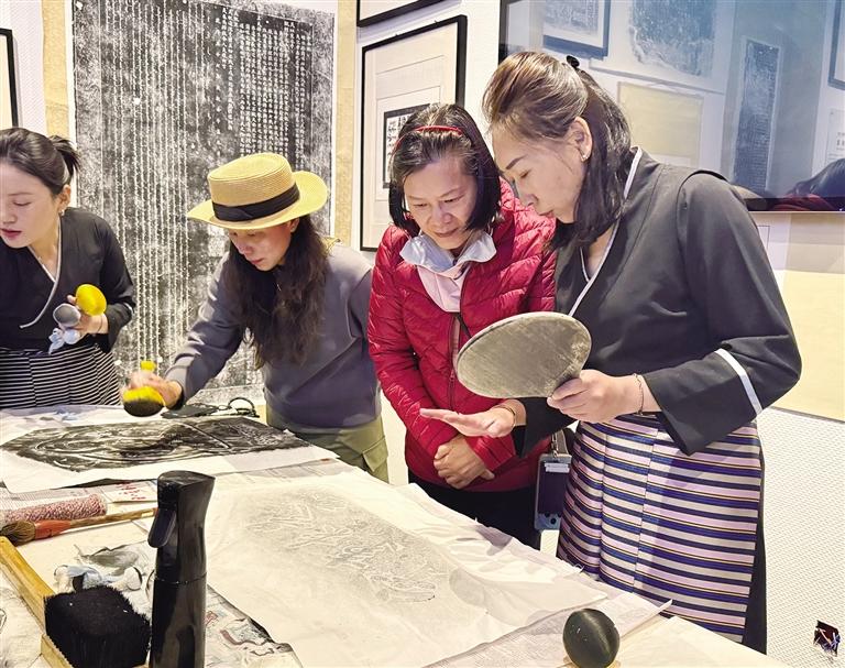 國際旅行商在日喀則石刻藝術(shù)博物館內(nèi)體驗拓片技藝。記者 張琳 攝