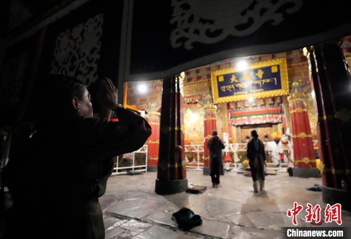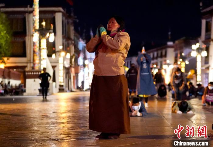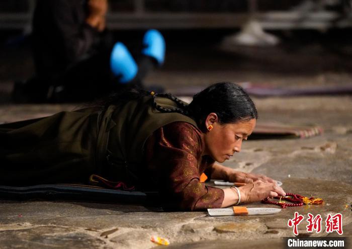 圖為當(dāng)日凌晨,信眾在拉薩大昭寺前磕長(zhǎng)頭。中新社記者 李林 攝