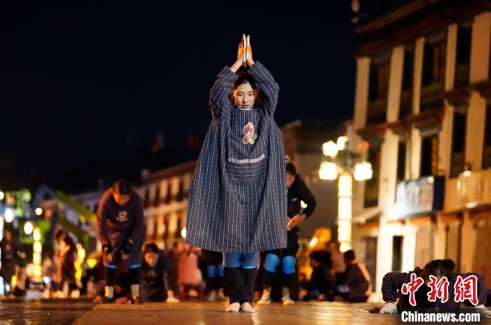 圖為當(dāng)日凌晨,信眾沿著拉薩八廓街磕長(zhǎng)頭。中新社記者 李林 攝