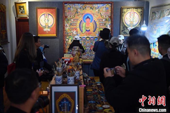 6月10日,來自美國、加拿大、瑞士、韓國等國家和地區(qū)的中外記者、網(wǎng)絡達人走進唐卡小鎮(zhèn)中的一家畫室觀摩采訪。九美旦增 攝