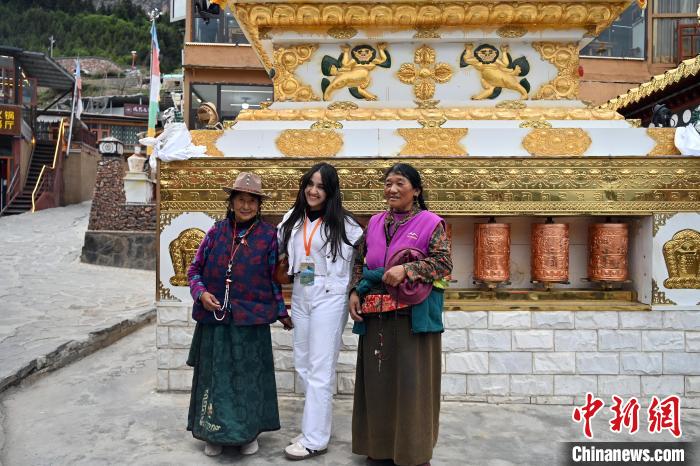 6月11日,甘肅迭部縣扎尕那村,迪拜中阿衛(wèi)視主持人阿思瑪(中)與當(dāng)?shù)鼐用窈嫌?。九美旦?攝