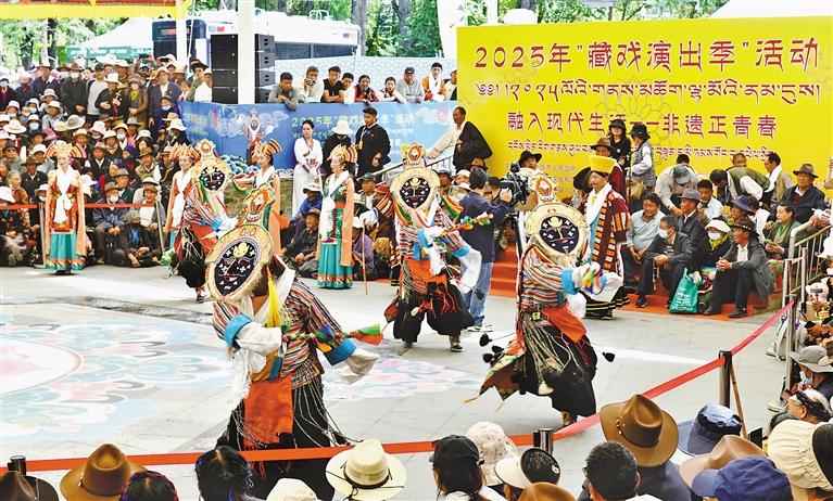 6月13日,以“融入現(xiàn)代生活——非遺正青春”為主題的2025年“藏戲演出季”活動(dòng)在拉薩市宗角祿康公園舉行。本次活動(dòng)由非遺體驗(yàn)、產(chǎn)品展銷、藏戲展演三個(gè)部分組成,精彩的表演吸引了眾多市民游客觀看。 圖為活動(dòng)現(xiàn)場(chǎng),拉薩市堆龍德慶區(qū)措麥藏戲隊(duì)帶來(lái)的藏戲劇目《智美更登》。記者 旦增蘭澤 攝
