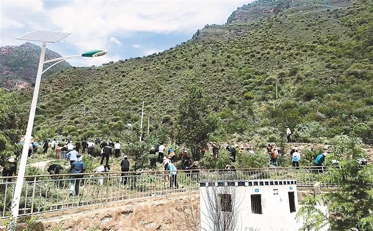 工作人員帶領(lǐng)群眾清除達(dá)若村花園雜草。