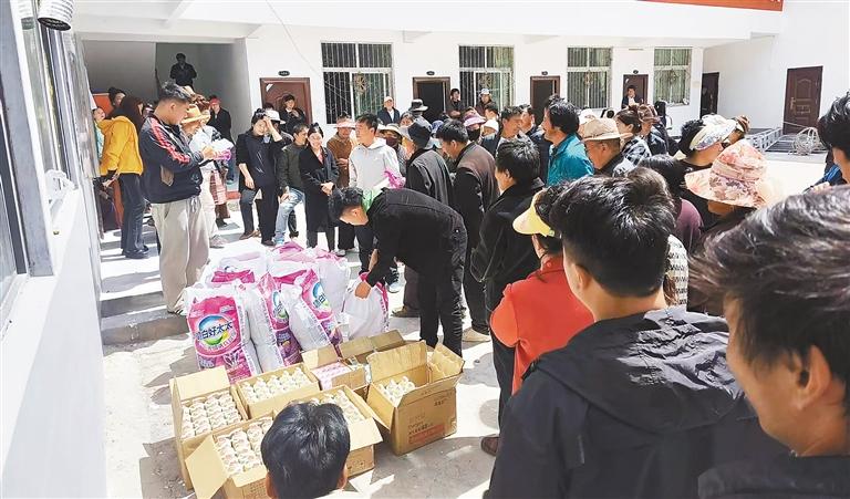 達(dá)若村村干部為村民發(fā)放清潔用品。記者 平措郎加 攝