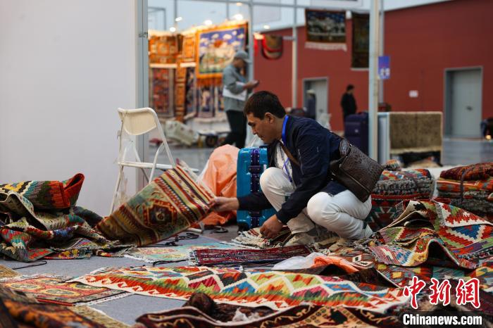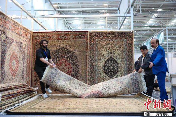 圖為來(lái)自巴基斯坦的參展商在擺放地毯。中新社記者 薛蒂 攝