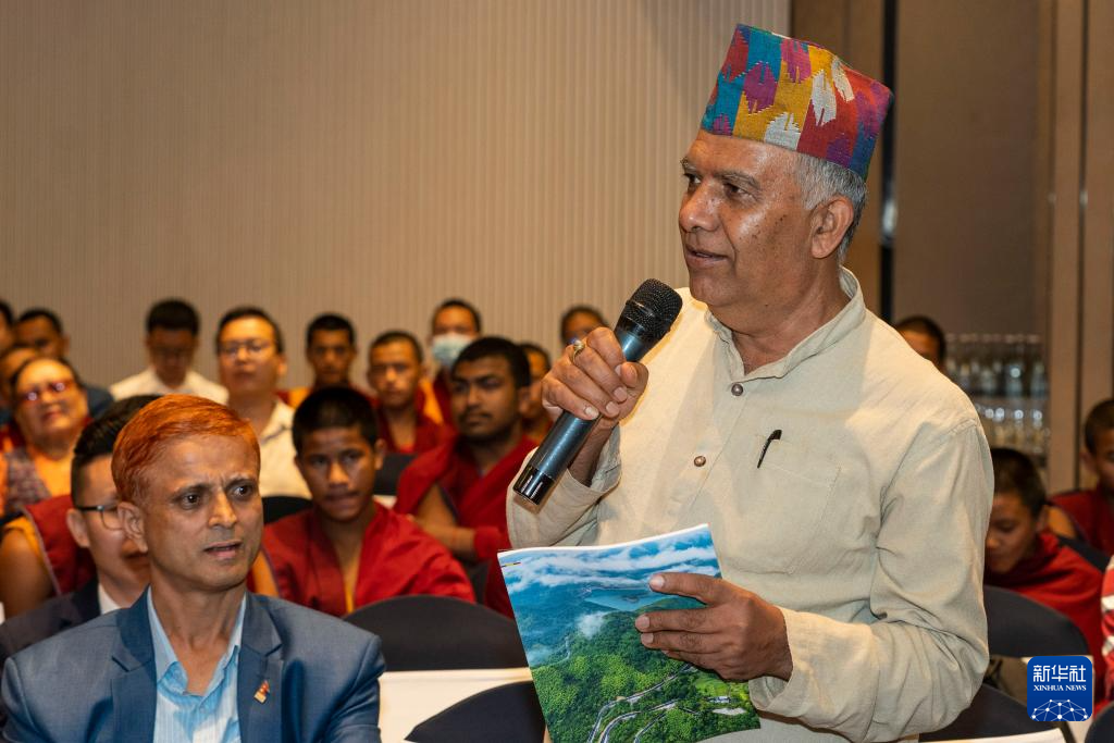 6月24日,一名與會(huì)者在尼泊爾加德滿都舉辦的交流會(huì)上提問(wèn)。新華社發(fā)(哈里·馬哈爾詹攝)