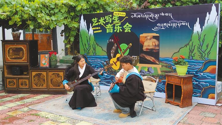 在音樂鑒賞環(huán)節(jié),拓崗扎念樂隊將傳統(tǒng)扎念琴演奏與現(xiàn)代音樂結(jié)合,表演了《卓木仁青崗》等曲目;青年歌手次仁羅布演唱藏族民歌,展現(xiàn)非遺特色。在藝術(shù)對談中,青年畫家雍忠卓瑪分享了自己克服身體障礙堅持創(chuàng)作的經(jīng)歷,圍繞“自然與藝術(shù)的關(guān)系”展開討論,結(jié)合作品從藏族文化和鄉(xiāng)土景觀中獲取創(chuàng)作靈感的過程。在寫生體驗環(huán)節(jié),活動參與者以德慶鎮(zhèn)民居和周邊自然景色為素材進(jìn)行創(chuàng)作,雍忠卓瑪從構(gòu)圖、色彩運用等方面給予指導(dǎo),幫助活動參與者完成10余幅繪畫作品。