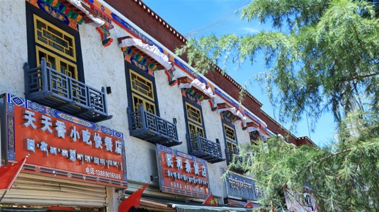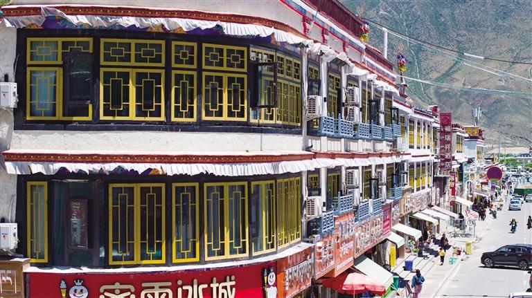值得關注的是,此次修復及新建的商鋪外立面特意采用傳統(tǒng)藏式繪畫工藝,選用新藏式風格,旨在弘揚獨特的當?shù)匚幕?,使其在現(xiàn)代城市中展現(xiàn)新活力。通過外立面裝飾改造形成統(tǒng)一風格后,老舊街區(qū)的藏式特色更加凸顯。