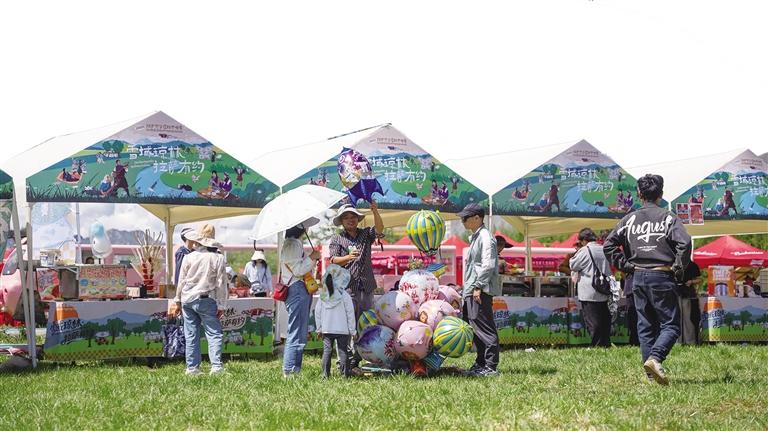 記者看到,綠野市集“沖賽康”充滿了煙火氣,30余家特色攤位齊聚林間。這里不僅有藏式甜茶、糌粑制品等傳統(tǒng)美食,讓游客大飽口福,還有氆氌文創(chuàng)、非遺手作等特色產(chǎn)品,滿足游客的購物需求。此外,互動游戲與民俗體驗也吸引了眾多游客參與,營造出充滿活力的林卡生活場景。