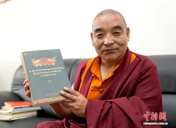 圖為班典頓玉展示其主編的珍貴藏文古籍叢書《薩迦噶彭寶典寶庫》。李林 攝