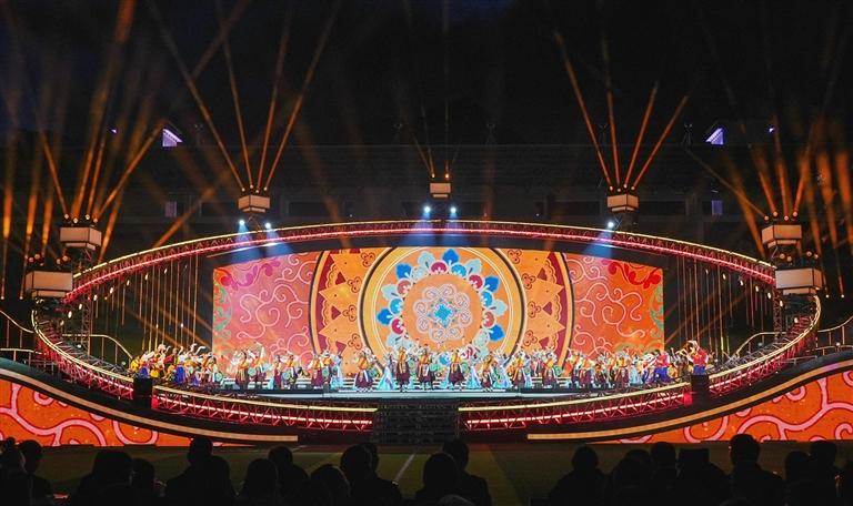 舞臺設計同樣暗藏巧思,主體采用巨型“同心圓”架構(gòu),設計中巧妙嵌入藏族傳統(tǒng)建筑的經(jīng)典紋樣,同時將山南的人文風貌與山水景致融入其中,讓地域特色與藝術(shù)美學自然交融。