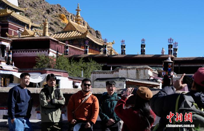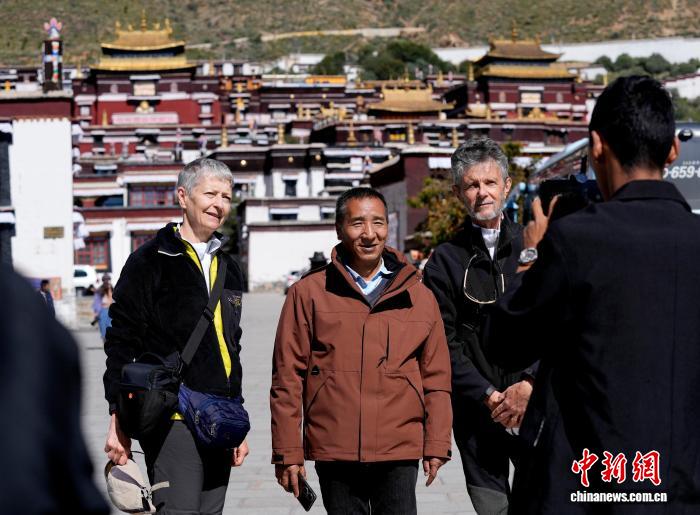 10月7日,外國游客在西藏日喀則市扎什倫布寺與導(dǎo)游合影留念。扎什倫布寺始建于公元1447年,是中國國家5A級旅游景區(qū)。憑借深厚的歷史底蘊(yùn)和獨(dú)特的文化魅力,吸引眾多中外游客參觀游覽。中新社記者 李林 攝