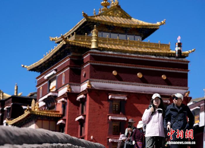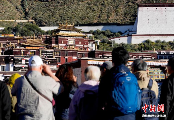 10月7日,游客在西藏日喀則市扎什倫布寺參觀。扎什倫布寺始建于公元1447年,是中國國家5A級旅游景區(qū)。憑借深厚的歷史底蘊(yùn)和獨(dú)特的文化魅力,吸引眾多中外游客參觀游覽。中新社記者 李林 攝