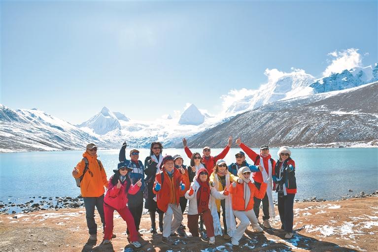 圖為電影主創(chuàng)人員與比如縣薩普旅游景區(qū)游客合影。記者 汪純 攝
