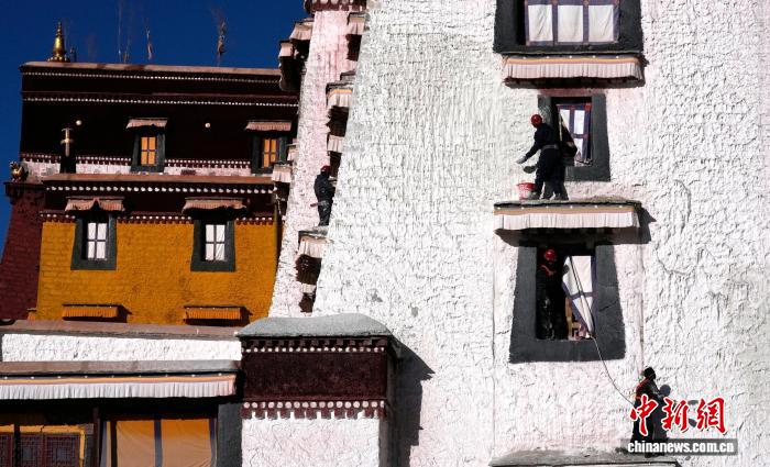 西藏布達(dá)拉宮22日迎來一年一度的粉刷“美顏”,民眾自發(fā)參與粉刷工作。