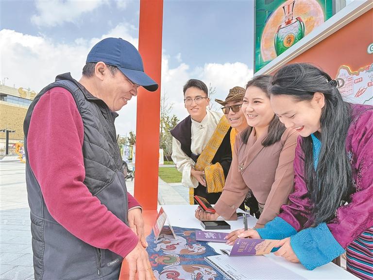 “萬人墨竹探親游”活動(dòng)的探親證發(fā)放處人潮擁擠,排隊(duì)申請領(lǐng)證的市民絡(luò)繹不絕?!拔覀儨?zhǔn)備了1萬本免費(fèi)發(fā)放的探親證,探親證上詳細(xì)介紹了紅色文化游、藍(lán)色康養(yǎng)游、綠色生態(tài)游、文化探秘游、墨竹深度游精品線路的詳細(xì)內(nèi)容供大家選擇。屆時(shí),我們將準(zhǔn)備好香甜的青稞酒、潔白的哈達(dá)、美味的藏餐等候咱們南京的兄弟姐妹回雪域高原的墨竹家中看看、坐坐?!蹦窆たh文化旅游公司負(fù)責(zé)人扎西措姆在探親證發(fā)放現(xiàn)場介紹道。