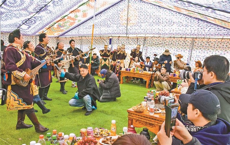 在篝火前,麥巴村的群眾和著音樂,跳著輕松歡快的工布鍋莊;帳篷里,遠(yuǎn)道而來的游客也換上工布藏裝,拍著照、聊著天,品嘗著甜美的青稞酒;非遺體驗(yàn)區(qū),書法家們現(xiàn)場(chǎng)揮毫的漢藏雙語書法作品送出了一幅又一幅;美食街上,各個(gè)攤位前擠滿了準(zhǔn)備大快朵頤的人。