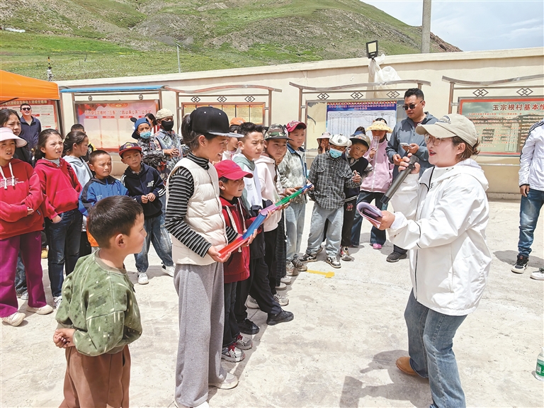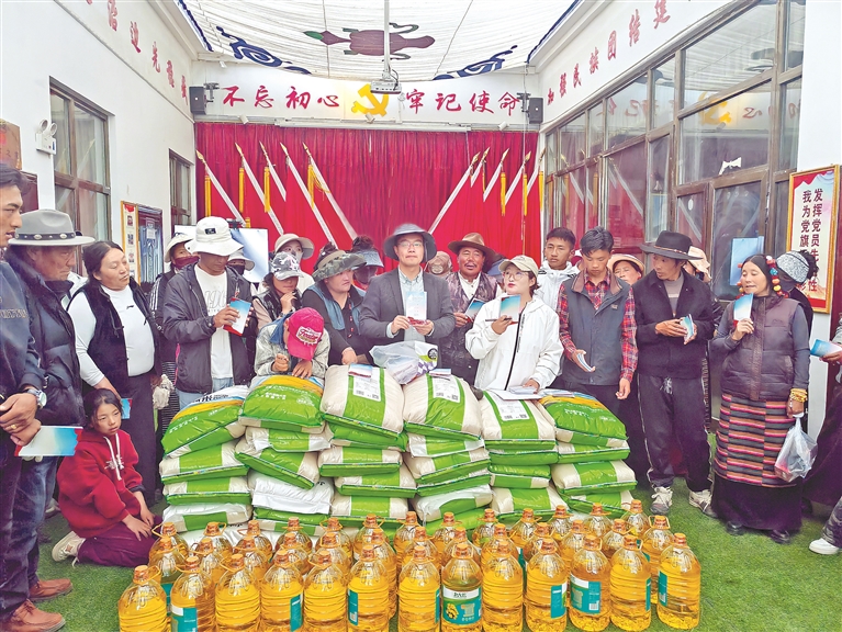 圖為駐村工作隊為牧民群眾宣講《西藏自治區(qū)農(nóng)牧民享受財政補助優(yōu)惠政策明白卡(2025年版)》,并發(fā)放慰問品。記者 王雨霏 攝