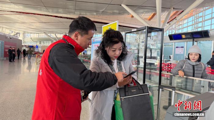 圖為在拉薩貢嘎國際機(jī)場,志愿者協(xié)助游客解決乘機(jī)問題。趙朗 攝