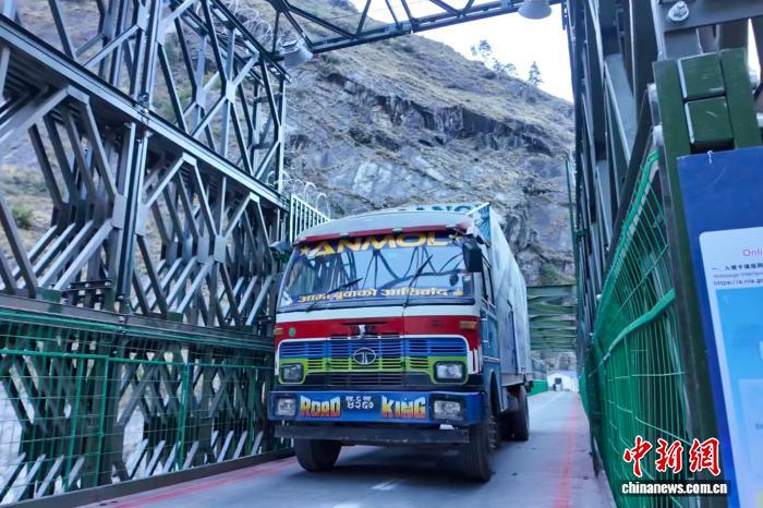 2026年1月1日上午,尼泊爾貨柜車經(jīng)吉隆熱索臨時便橋駛?cè)胛鞑刈灾螀^(qū)日喀則市吉隆口岸。(吉隆縣融媒體中心供圖)