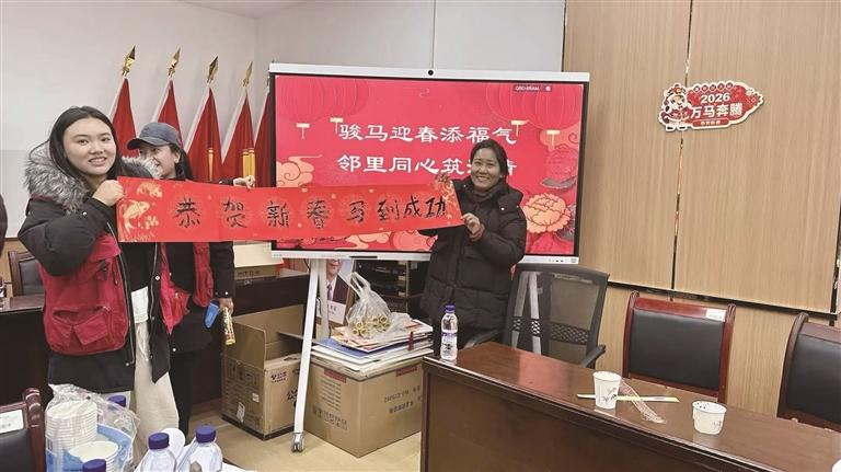 在手工區(qū)內(nèi),居民們揮毫寫春聯(lián)、繪“?!弊郑P尖流淌祝愿;孩童專注涂畫,小馬圖案躍然紙上,童趣盎然。黨建主題打卡點(diǎn)前,居民手舉“福”字、展露笑顏,拍下馬年第一張團(tuán)圓合影。一份份滿載心意的宣傳品,也將黨組織的溫暖問(wèn)候送入千家萬(wàn)戶。