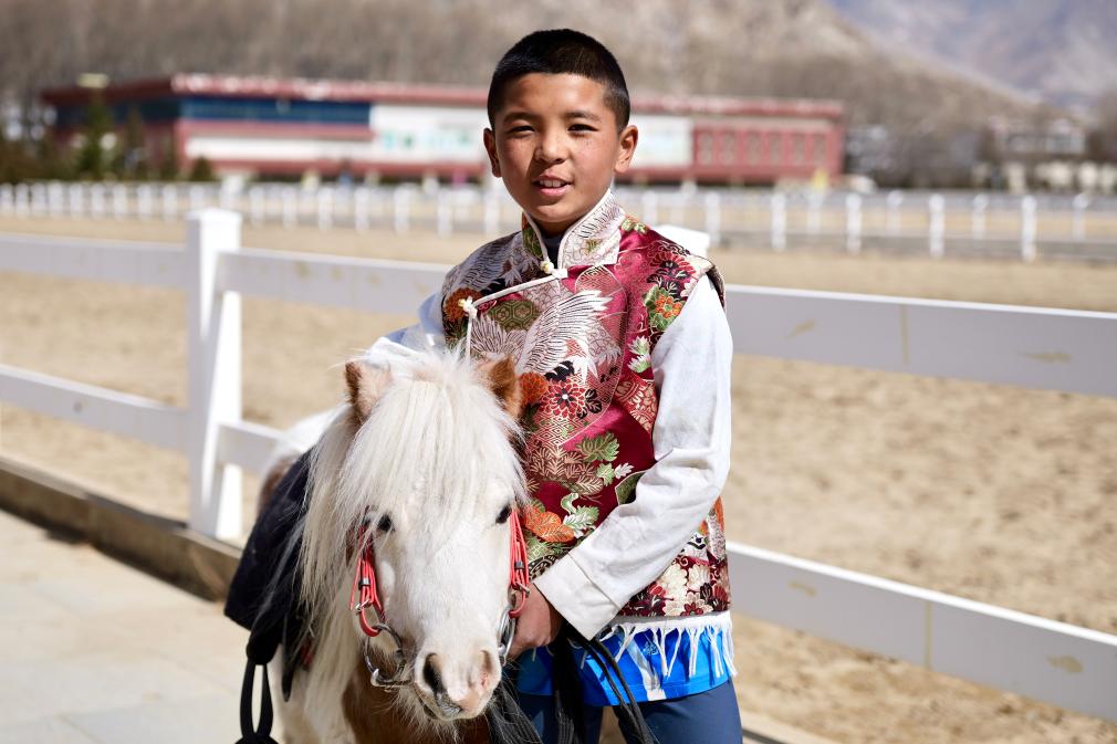 這是小騎手旦增晉美和他的馬匹“小白”。新華社記者 周昱龍 攝