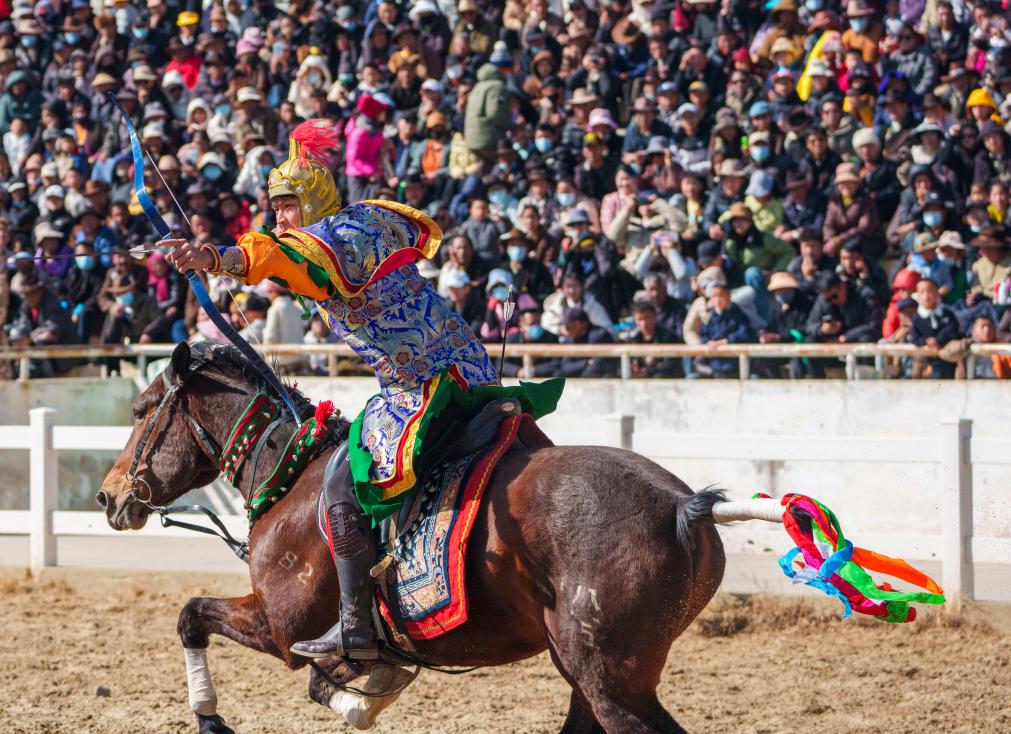 2月20日,馬術(shù)隊員在表演馬背傳統(tǒng)響箭技巧。新華社記者 丁增尼達(dá) 攝