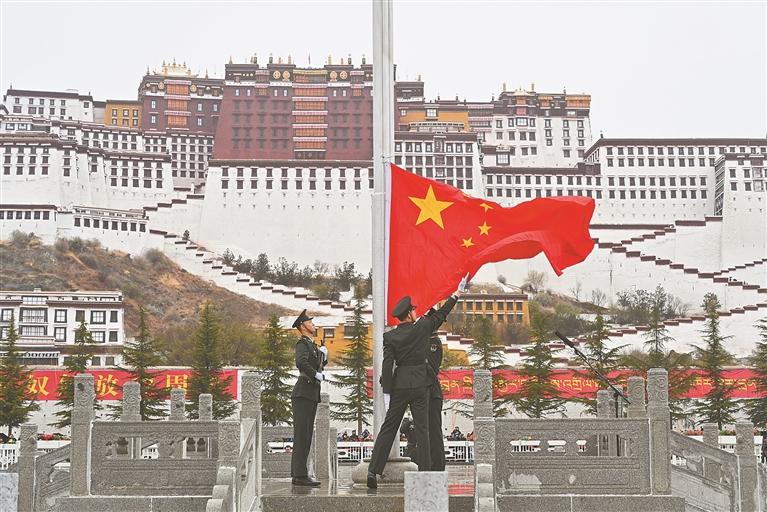 3月28日上午,紀念西藏百萬農(nóng)奴解放67周年“升國旗 唱國歌”儀式在拉薩布達拉宮廣場舉行。圖為儀式現(xiàn)場。記者 次仁平措 攝