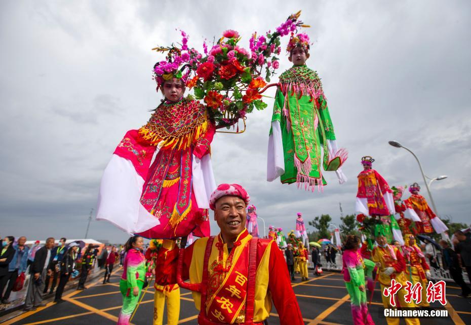 9月23日,山西晉中,當(dāng)?shù)孛癖姳硌萆缁饝c祝豐收節(jié)。當(dāng)日,2021年中國(guó)農(nóng)民豐收節(jié)山西慶祝活動(dòng)暨第七屆中國(guó)(山西)特色農(nóng)產(chǎn)品交易博覽會(huì)在晉中國(guó)家農(nóng)高區(qū)(山西省農(nóng)產(chǎn)品國(guó)際交易中心)開(kāi)幕。 中新社記者 張?jiān)?攝