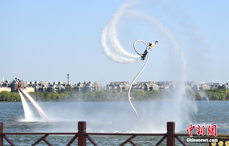 9月23日下午,2021年中國(guó)農(nóng)民豐收節(jié)浙江嘉興主場(chǎng)其中一項(xiàng)子活動(dòng),“亮絕活·樂(lè)豐收”長(zhǎng)江水文化習(xí)俗展演活動(dòng)在浙江嘉興湘家蕩月亮灣沙灘舉行。歌舞表演、非物質(zhì)文化遺產(chǎn)技藝表演、水上特技表演等特色融合節(jié)目集中亮相,精彩的演出吸引了觀看者掌聲不斷。圖為兩名演藝者在水上表演“水上特技”。張茵 攝