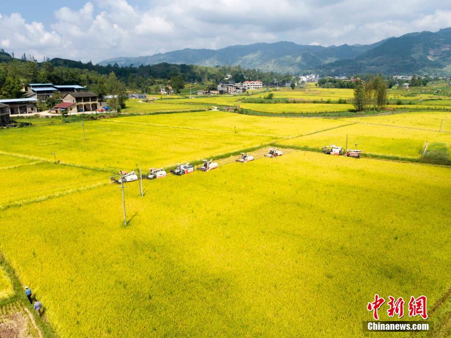 9月23日,2021年中國(guó)農(nóng)民豐收節(jié)·第一屆“天生云陽(yáng)”金秋節(jié)在重慶云陽(yáng)縣鳳鳴鎮(zhèn)拉開(kāi)序幕。時(shí)下正是豐收的季節(jié),三峽庫(kù)區(qū)腹地重慶云陽(yáng)縣的農(nóng)民門(mén)正忙著搶收搶曬,確保水稻玉米等農(nóng)作物顆粒歸倉(cāng)。圖為在重慶云陽(yáng)縣路陽(yáng)鎮(zhèn),一字排開(kāi)的8臺(tái)大型收割機(jī)正在稻田中收割成熟的水稻。劉興敏 攝